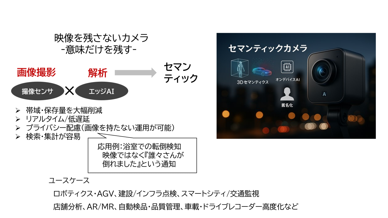 >「セマンティックカメラ」は、撮影した静止画または動画から要素を抽出し、情報のみを残すものです。画像/映像データを転送・処理しないことから、データ容量が小さくなる利点がある他、プライバシーも保護されるため、例えば、浴室内での転倒事故の検知など幅広い用途での活用が期待されています。 ★シャープでも「セマンティックカメラ」へ応用可能なAI高位合成ツール「AIRTIPS」(市販カメラ+FPGA活用)の開発をしました。詳しくはnote “sharp_engineer”の記事をご覧ください。