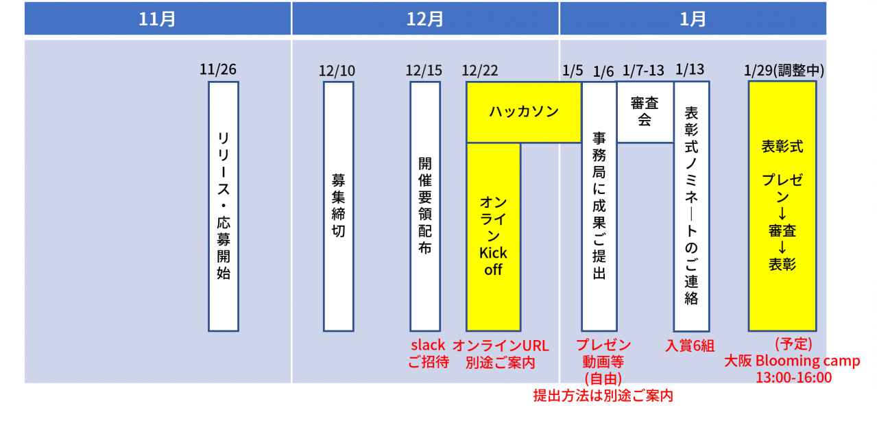 ・個人、チームで応募される場合も、参加者全員の参加規約の同意確認( オンライン応募申込または参加規約への署名) が必要です。 ※応募時はオンライン応募で代表者のみが参加規約に同意頂くことになります。12月15日の参加者決定後、参加者全員に同意頂きます。 ・12月22日(月) 18:00-19:00 開催予定のオンラインKick offへの参加頂きます。 ★参加できない場合はkick offの動画をご視聴頂きます。(応募者向けに動画公開予定)