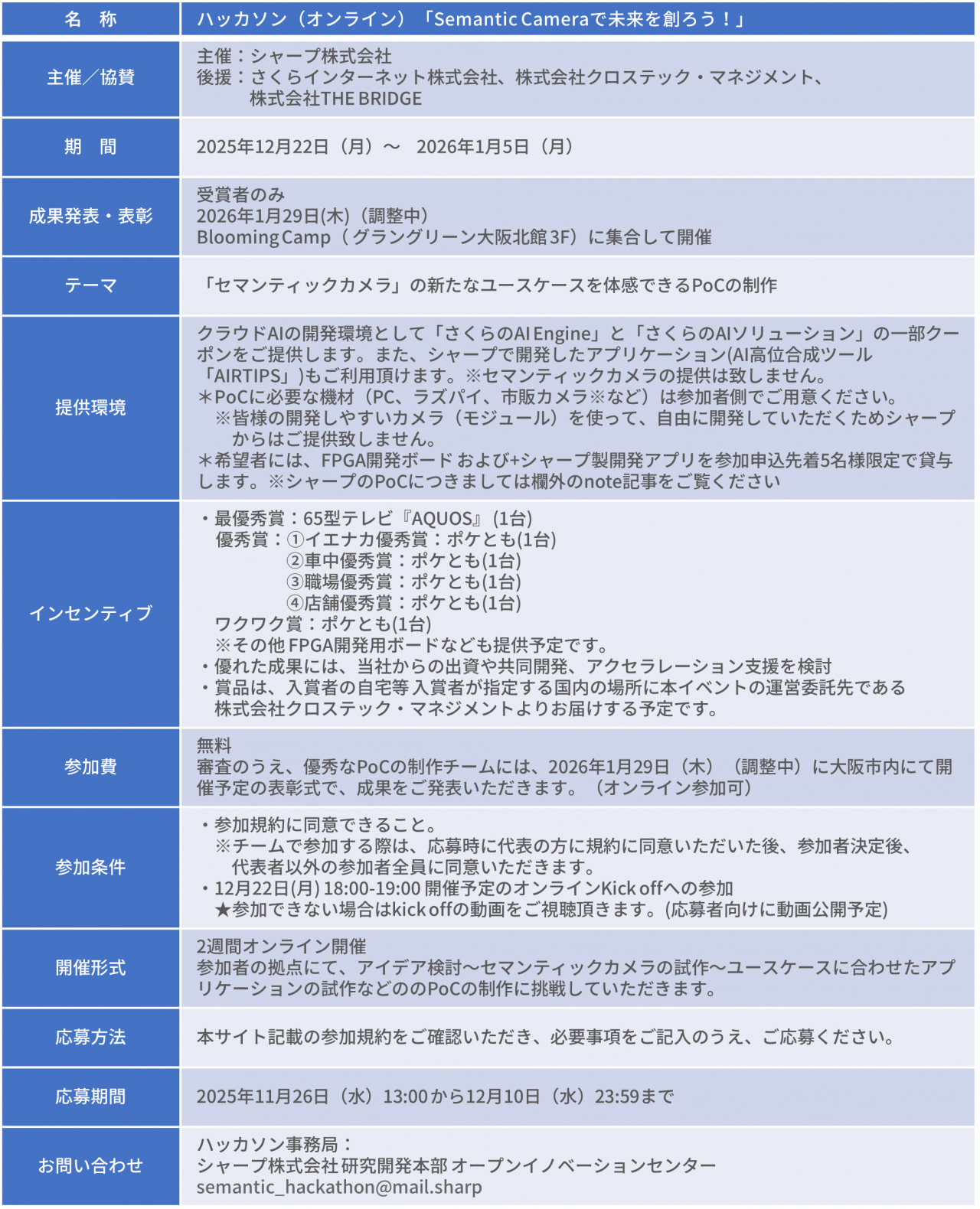 (2)参加者は、本イベント応募後に辞退せざるを得ない場合は、速やかに開催概要に記載しておりますお問い合わせ先までご連絡下さい。>本ハッカソンでの開発成果は、審査のうえ、2026年1月29日(木)(調整中)の表彰式で発表となります。最優秀賞の受賞チームには、賞品として65型テレビ『AQUOS』を授与。さらに、優れた成果を残したチームには、今後の共同開発や当社からの出資、アクセラレーション支援なども検討する予定です。>当社は、ハッカソンをはじめ、さまざまな技術やバックグラウンドをお持ちの方々との共創により、新コーポレートスローガン「ひとの願いの、半歩先。」に則った、革新的な製品やサービスの創造に取り組んでまいります。■開催概要